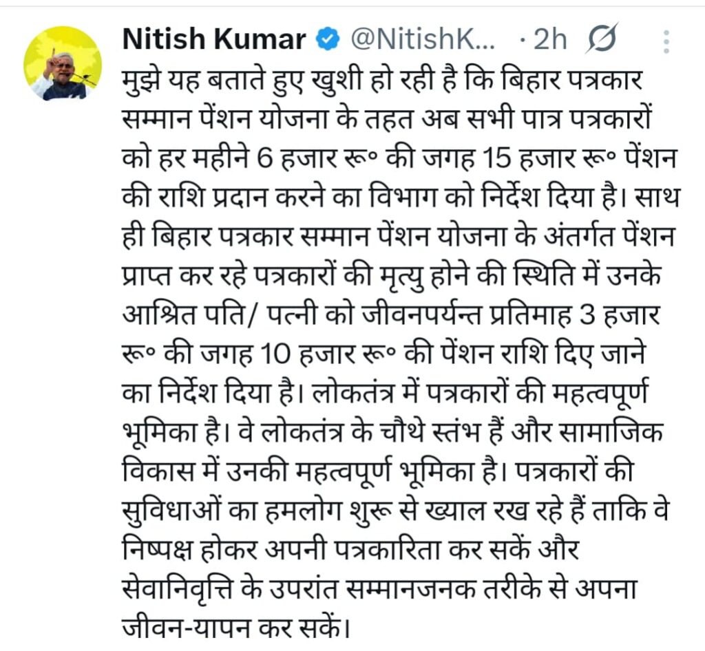 गौरतलब हो कि मुख्यमंत्री नीतीश कुमार ने बिहार पत्रकार सम्मान पेंशन योजना की राशि को 6000 से बढ़ाकर 15000 रुपये प्रतिमाह कर दी है। साथ ही, पत्रकार पेंशन पा रहे पत्रकारांे की मृत्यु होने की स्थिति में उनके आश्रित पति या पत्नी को 3000 की जगह 10000 रूपए प्रतिमाह जीवन पर्यंत दिए जाने की बात कही गई है। नीतीश कुमार की घोषणा के बाद से मिलीजुली प्रतिक्रियाएं सामने आ रही है। ऐसे में कई पत्रकारों ने अपनी परेशानियों के जरिए योजना की सार्थकता पर सवाल उठा दिया है।